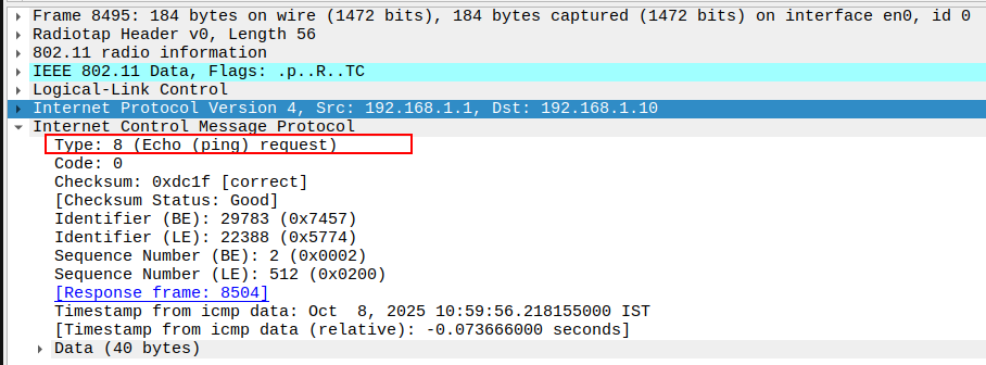 The ICMP Echo Reply is sent by the AP back to the STA in response to the Echo Request.