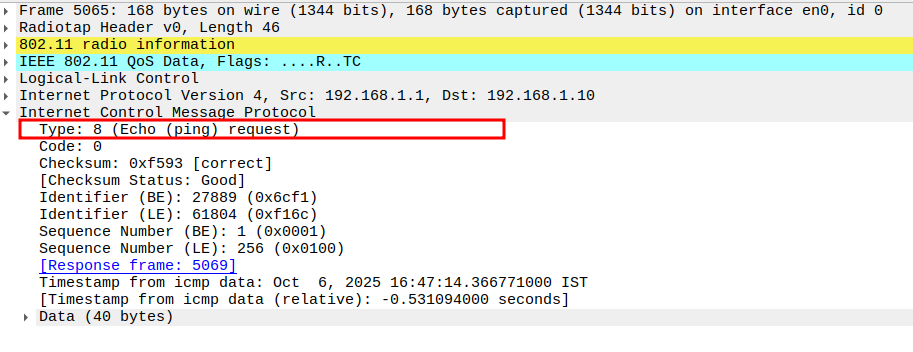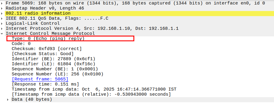 The ICMP Echo Reply is sent by the AP back to the STA in response to the Echo Request.