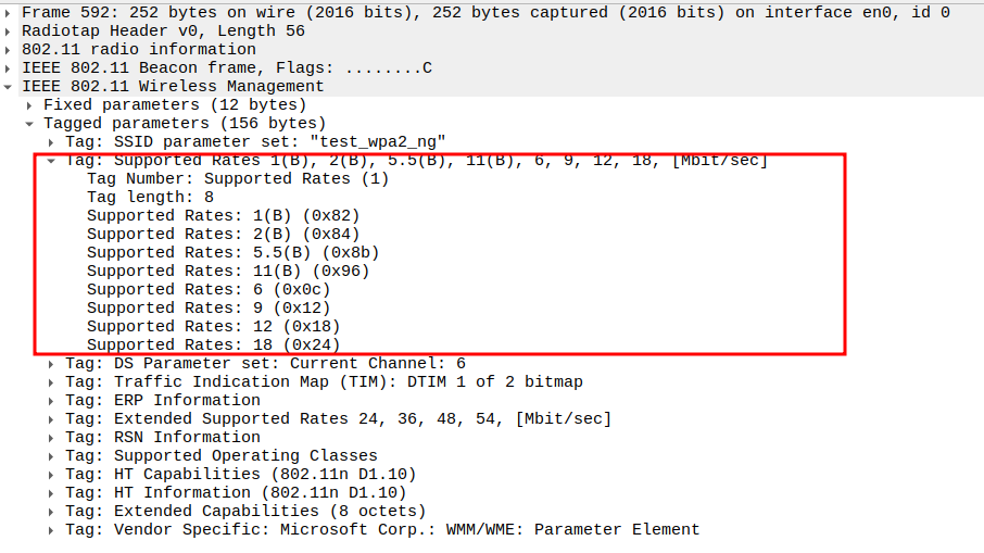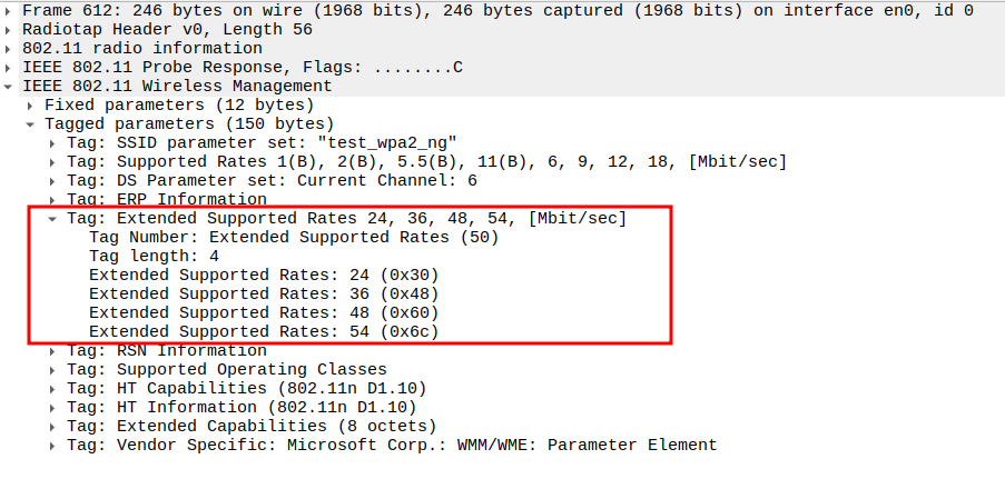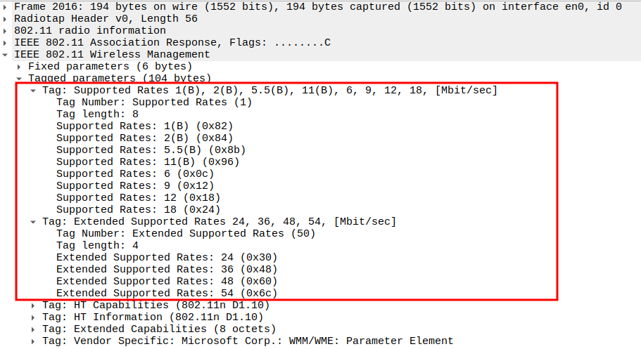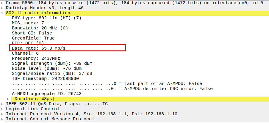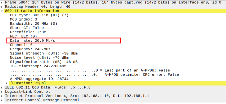Data Rate indicates the PHY rate used by the STA (e.g., 24 Mbps or 36 Mbps).