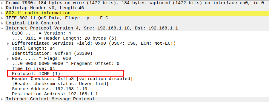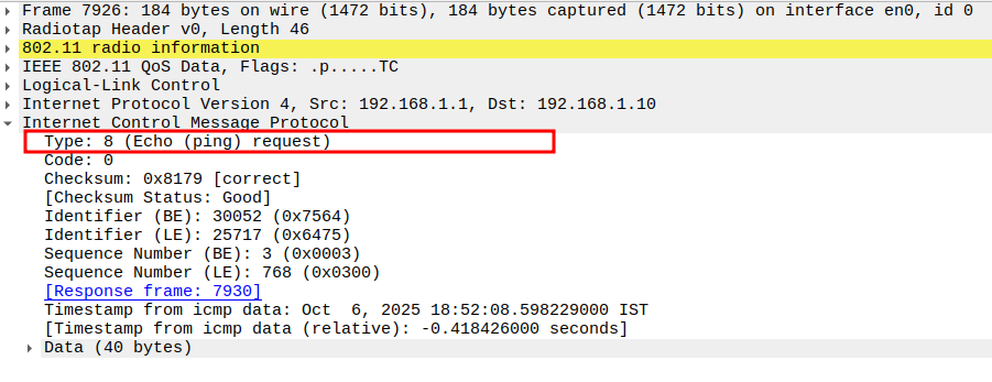 The ICMP Echo Reply is sent by the AP back to the STA in response to the Echo Request.