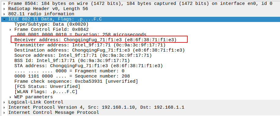 It is encapsulated inside an 802.11 Data frame and usually sent unicast to the AP.