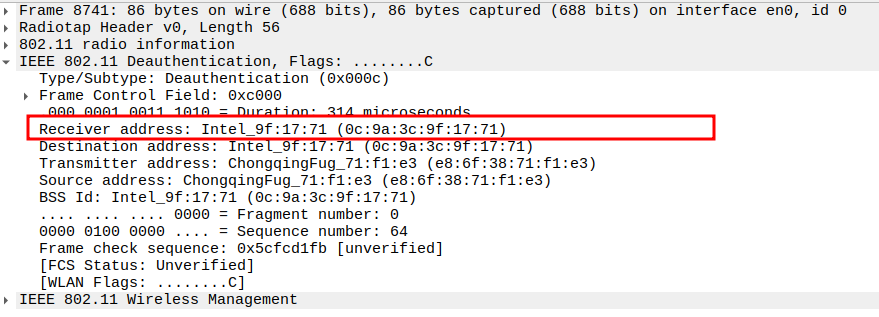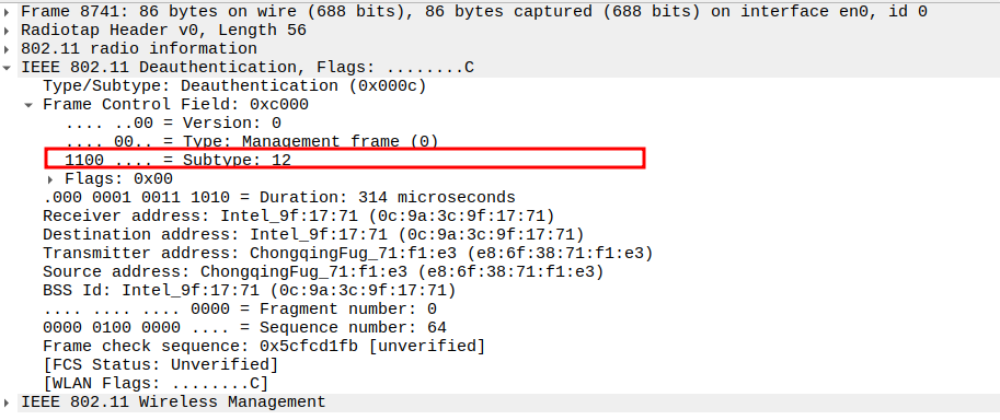 - Includes Reason Code (e.g., 0x0001: Unspecified reason,0x0004 → Disassociated due to inactivity,