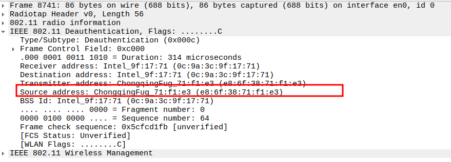 MAC address of the device sending the deauthentication frame (AP or STA).