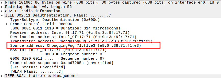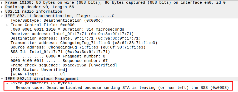 Subtype = 12 identifies the frame as Deauthentication.