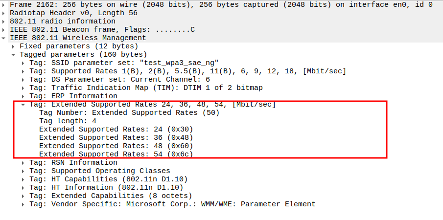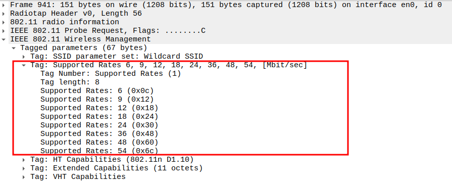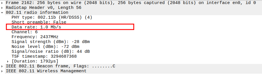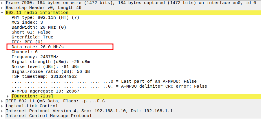 Data Rate indicates the PHY rate used by the STA (e.g., 24 Mbps or 36 Mbps).